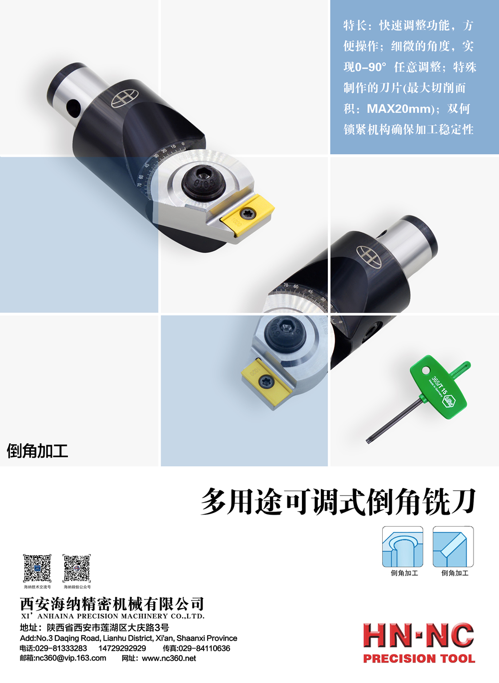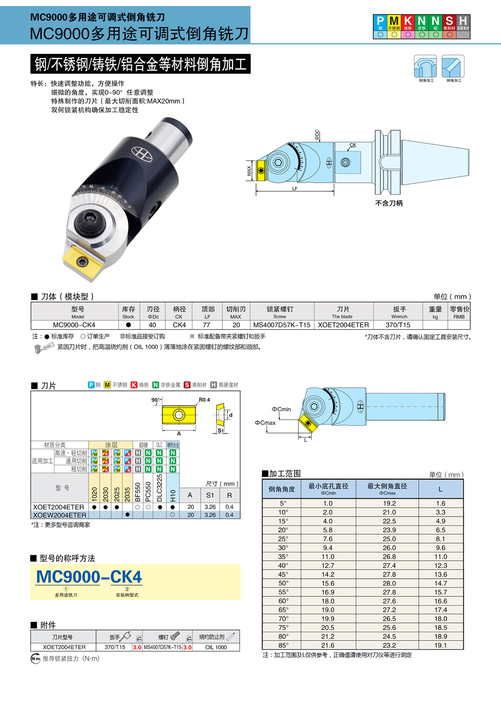 MC9000系列多用途可调式倒角铣刀具有以下特长:快速调整功能,方便操作;细微的角度,实现0-90°任意调整;特殊制作的刀片(最大切削面积:MAX20mm);双何锁紧机构确保加工稳定性。
