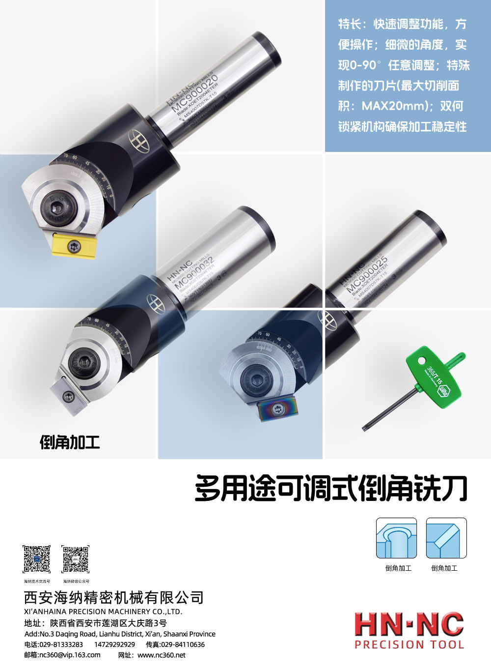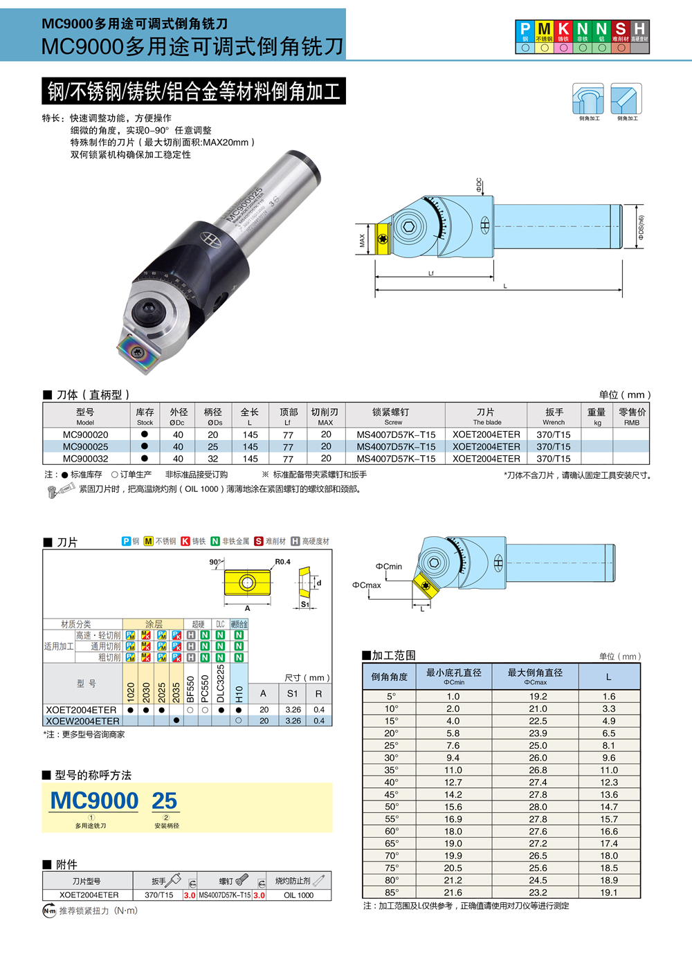 MC9000系列多用途可调式倒角铣刀具有以下特长:快速调整功能,方便操作;细微的角度,实现0-90°任意调整;特殊制作的刀片(最大切削面积:MAX20mm);双何锁紧机构确保加工稳定性。