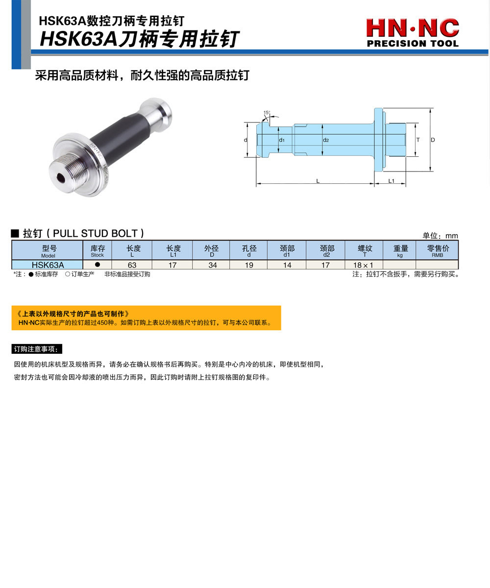 HSK63A 15度加工中心主轴拉钉中心机拉栓配件